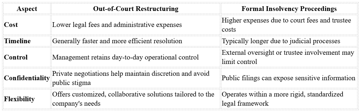In short, out-of-court restructuring offers a practical and efficient alternative to bankruptcy, enabling companies to address financial challenges while preserving their operational and reputational integrity.