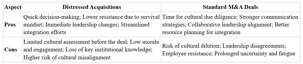 Cultural alignment strategies in distressed acquisitions and standard M&A deals come with their own sets of benefits and challenges. Weighing these trade-offs is essential for companies to decide how best to approach integration and allocate resources effectively.