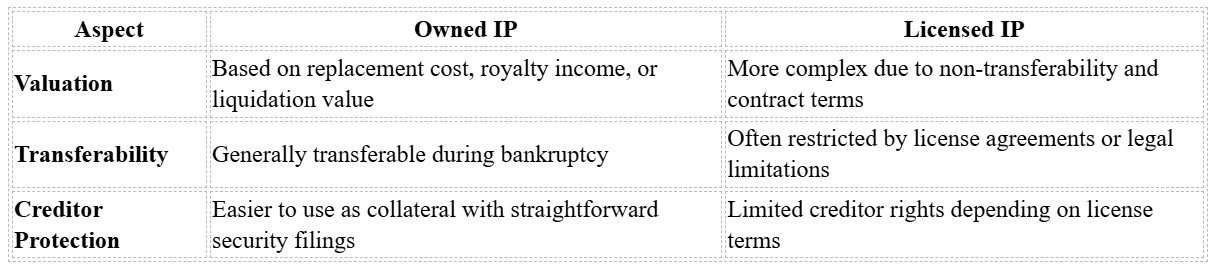 The valuation of IP in bankruptcy varies significantly depending on whether the asset is owned outright or licensed. Owned IP is often easier to value and transfer, while licensed IP presents unique challenges due to contractual restrictions.