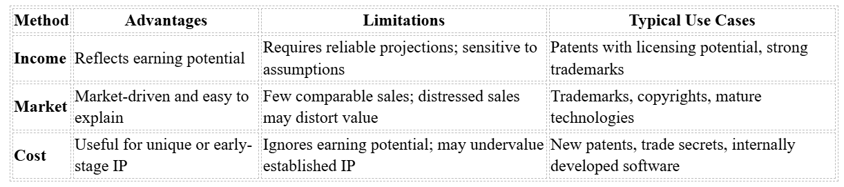 - Income Approach: Focuses on future income potential (e.g., royalties).