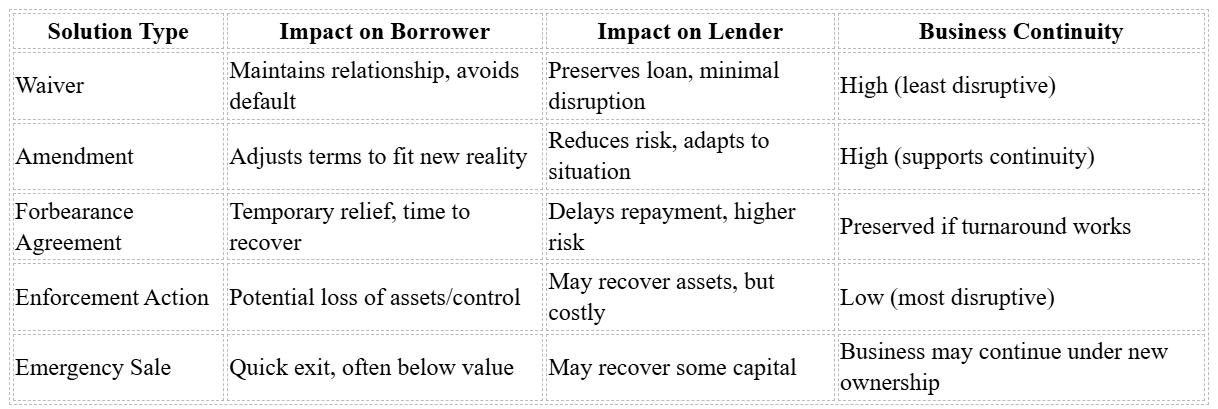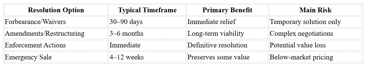 Once you’ve documented the situation and engaged key stakeholders, the next step is to explore potential solutions. Borrowers and lenders, often with input from advisors, consider resolution options by weighing factors like the severity of the breach, financial stability, and overall risk tolerance. Each approach comes with its own set of trade-offs, requiring careful thought about timing, costs, and long-term outcomes.
