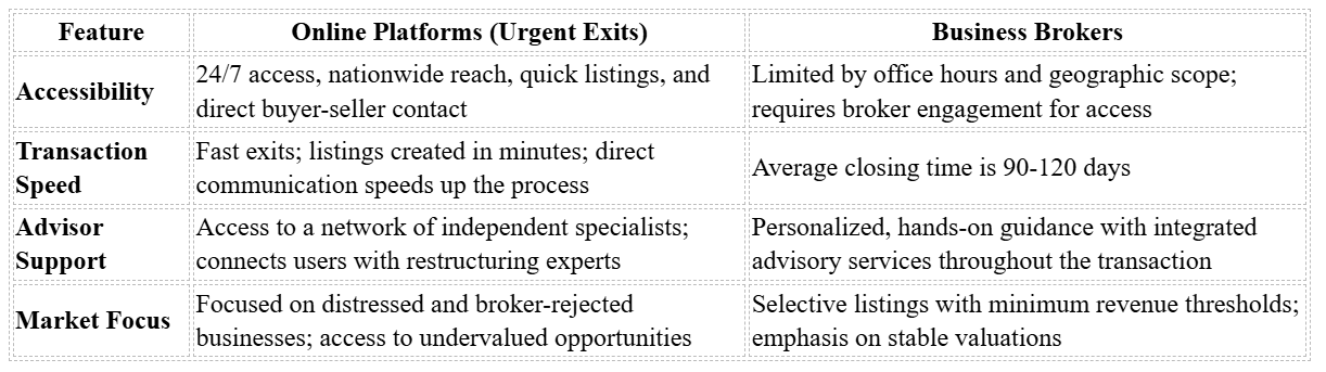 When comparing online platforms like Urgent Exits with traditional business brokers, it’s clear that each approach has its own strengths and limitations. Understanding these differences can help buyers, sellers, and advisors choose the option that aligns best with their specific circumstances, especially during periods of financial pressure.